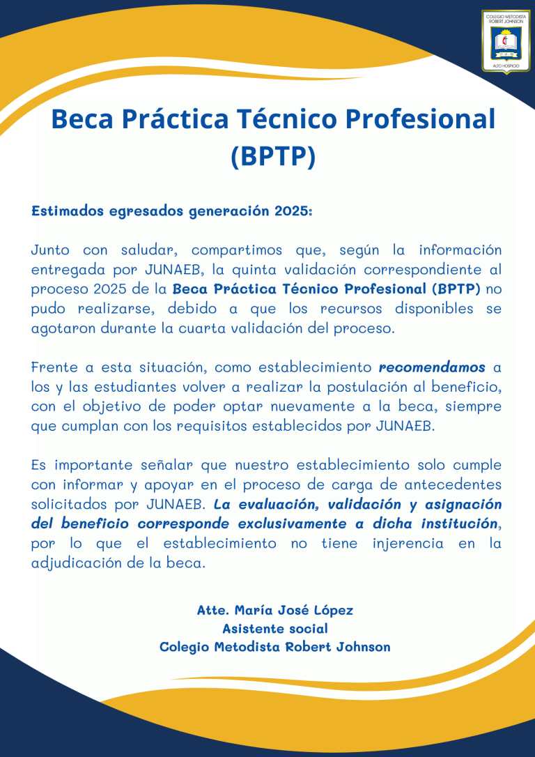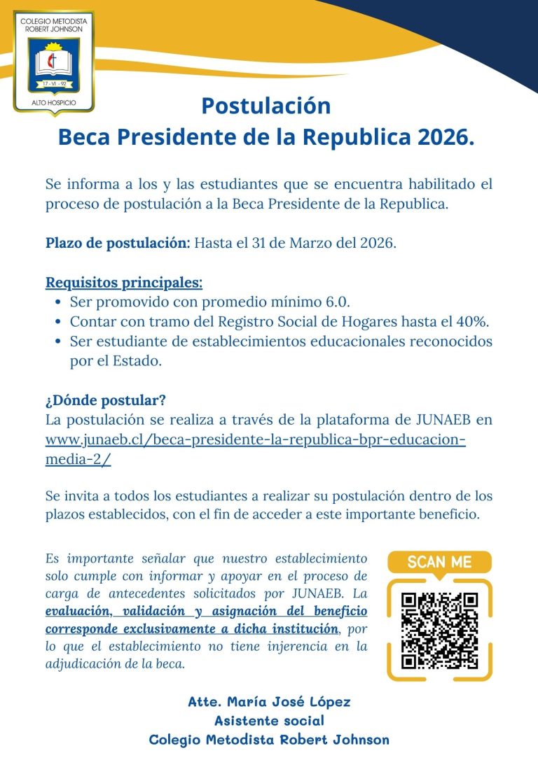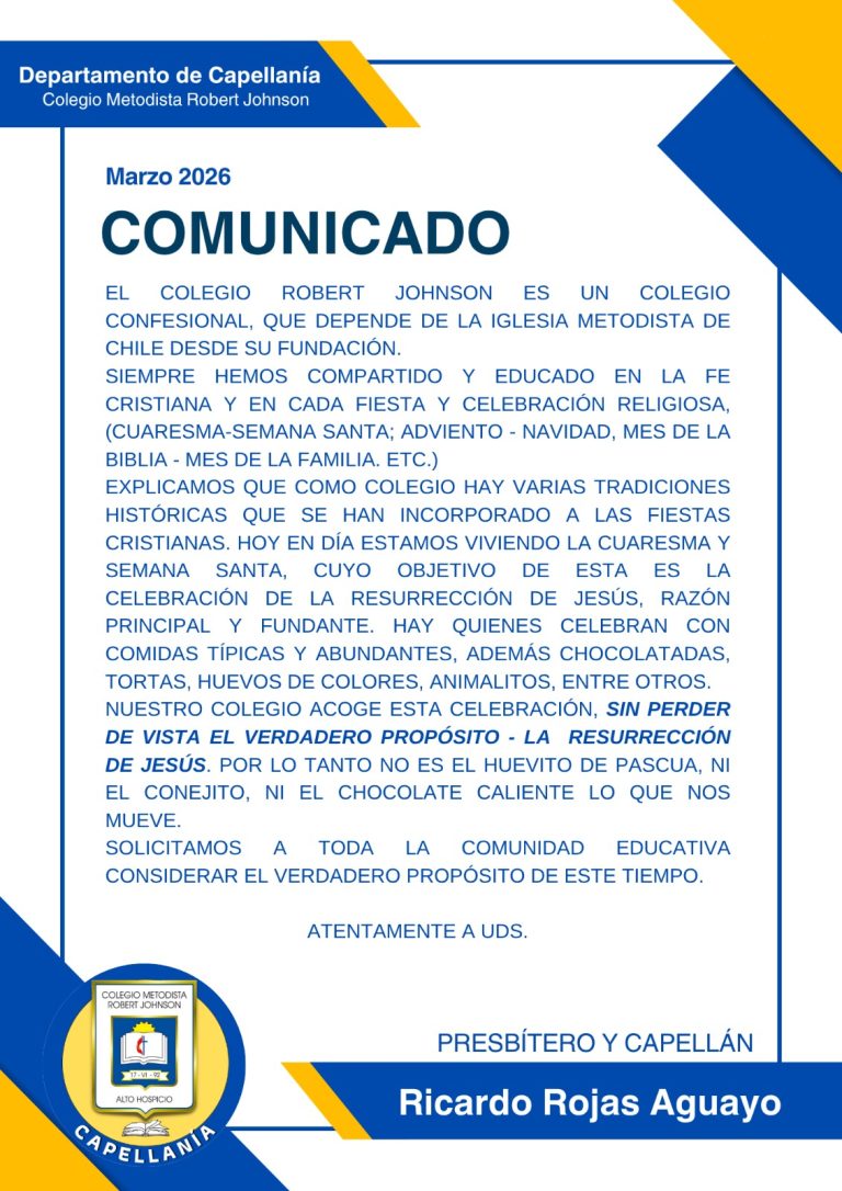 Con más de 30 años de historia al servicio de Alto Hospicio, nuestro colegio, perteneciente a la Iglesia Metodista de Chile, se ha consolidado como una institución reconocida por su educación integral, basada en valores cristianos, la inclusión y la sana convivencia. Acompañamos a nuestros estudiantes en su desarrollo académico, valórico y técnico profesional, impulsando especialidades que aportan al crecimiento de la comuna y la región. Junto a las familias, trabajamos día a día para formar personas responsables, solidarias y comprometidas con el bien común, confiando en que cada paso que damos es guiado por nuestro Señor.